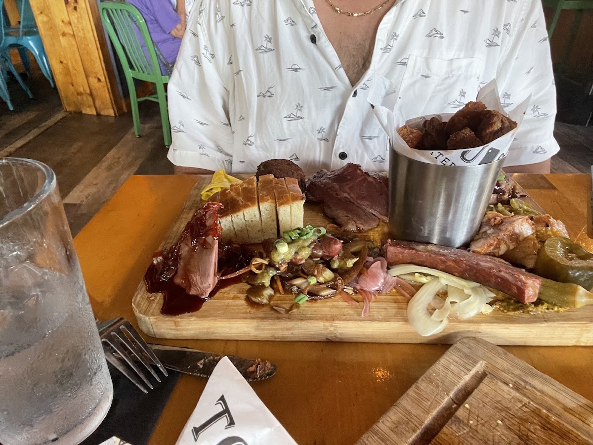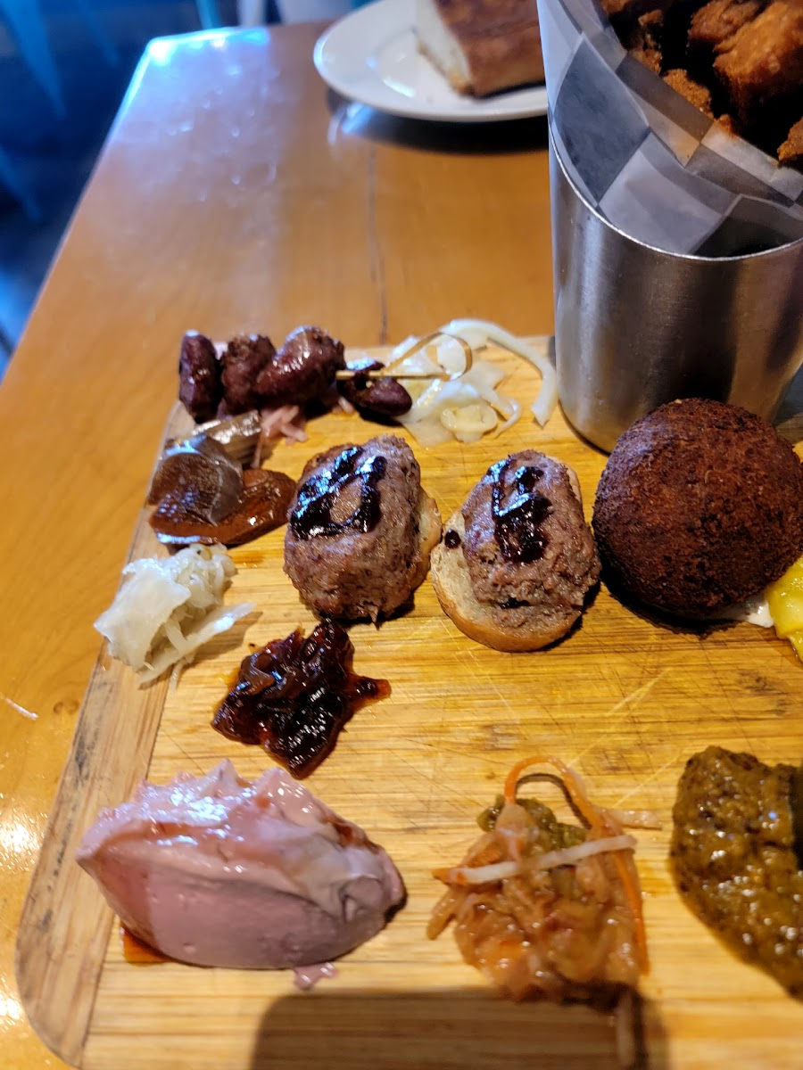 Come with an empty belly or a lot of friends. The three bone porkchop was cooked and seasoned perfectly, but was enough for two or three people to share especially if you also order the meat platter appetizer. The cracklins were better than the rillons. We were there at 8PM on a Friday evening and were one of three tables. Our server (who may have been the owner ? ) gave off New York vibes; rushed, distracted, efficient.