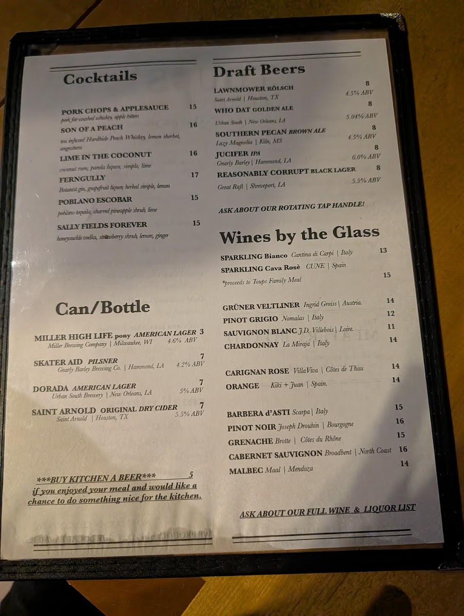 The menu at Toups Meatery offers a thoughtful blend of Cajun and Southern flavors with a casual, approachable bistro style. It’s designed for those who appreciate hearty, well-crafted dishes that feel both familiar and a little special. Whether it’s a leisurely brunch featuring items like the fried chicken sandwich or redfish benedict, or a relaxed dinner with shareable plates such as boudin balls and cracklins, the menu fits comfortably into a warm, convivial atmosphere.